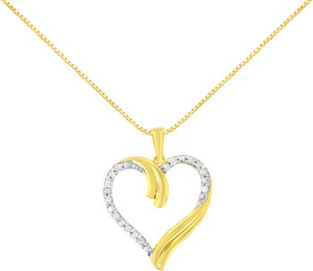 Fashioned in 10k yellow gold plated sterling silver, this looping ribbon open heart pendant is adorned with sparkling round cut diamonds. The 1/10ct TDW diamond pendant dangles from a box chain that secures with a spring ring clasp.