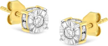 You've found your everyday wear accessory with these beautiful 10k yellow gold plated .925 sterling silver studs embellished with natural, sparkling diamonds. Each earring is set with a round-cut diamond in a miracle plate setting, while the inner component of the piece is studded with smaller round-cut diamonds for that extra sparkle. The push back mechanism keep these pierced earrings safe and secure on your ears for comfortable, worry-free wear all day long. You can't go wrong with these timeless 1/2 cttw earrings.