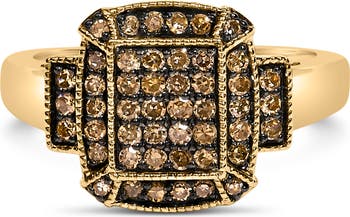 Embrace the sublime craftsmanship of this exquisite ring, where .925 sterling silver meets the lustrous glow of 10K yellow gold plating. This piece is a testament to refined elegance, featuring a unique rounded rectangle core accented with steps that cascade down each side, lined with a beaded, milgrain finish that whispers of vintage charm. At its heart, the ring boasts a radiant array of natural champagne diamonds, totaling 1/2 carat. These gems, set against a striking black rhodium backdrop, glow warmly, their amber light reminiscent of a sunset. Each diamond, sourced from the earth, brings with it a tale of mystery and time. Rich in detail and steeped in sophistication, this ring promises not just adornment but a profound emotional connection, enhancing the glamour and grace of those who wear it.