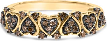 Crafted in the warm embrace of 10K yellow gold plating over .925 sterling silver, this exquisite ring strikes a note of romantic elegance with its enchanting heart-shaped motifs. Each delicate heart cradles natural brown or champagne-colored diamonds, sumptuously set against the glint of black rhodium accents to amplify their rich, earthy tones. With a total diamond weight of 1/3 carat, these natural gems are meticulously sourced, assuring both ethical integrity and exceptional quality. This ring, designed to epitomizes both luxury and sentiment, making it a perfect testament to love's enduring beauty.