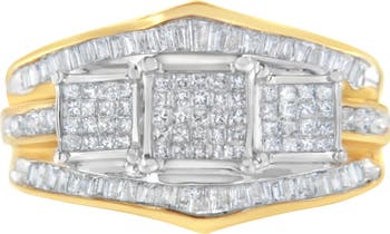 A unique gold and diamond cluster ring. This ring is made with 6 round, 53 baguette, and 57 princess-cut diamonds, weighing a total of 1 ct. The diamonds are set in lustrous 14k two-toned gold.