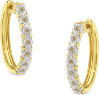 This pair of hoop earrings features shimmering diamonds set in 10 karat two-tone gold. Each earring has seven round diamonds set in a miracle setting to enhance their brilliance. The total diamond weight is .48 carats. They are built with leverback closures.