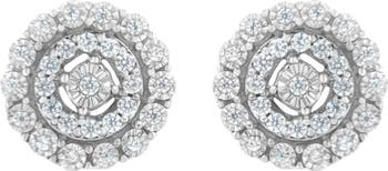 These striking stud earrings are crafted in polished 10k white gold and feature 1/2ct TDW of diamonds. A round cut diamond sits at the center of the design. A double floating halo studded with additional sparkling round diamonds wraps around the center stone. A screw on mechanism keeps the earrings secure.