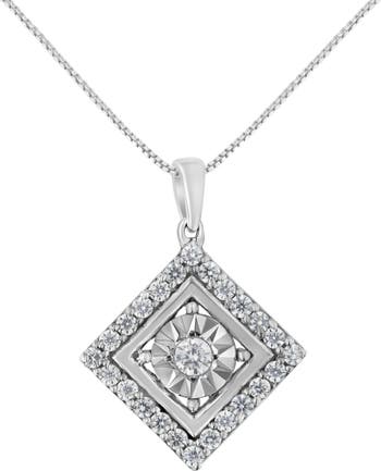 Elegant and unique, this 10k white gold square-shaped pendant will sparkle on your neck. This beautiful necklace features a single, beautiful miracle set, round-cut diamond at the center of the design. The diamond is framed by a layer of white gold, and a layer of 24 stunning round-cut diamonds. This fabulous necklace will become a staple in your everyday wear.