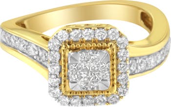 A diamond cocktail ring featuring a cluster of diamonds in a square shape surrounded by a halo of round diamonds. The asymmetrical band is crafted in 10 karat yellow gold and add a modernist touch to this unique design. It has a total diamond weight of 5/8 carats.