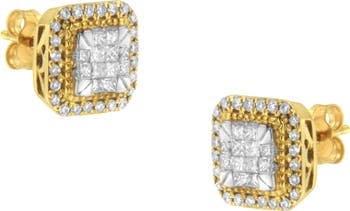 A pair of square diamond cluster stud earring that sparkle with a central cluster of princess cut diamonds surrounded by a halo of round diamonds. Milgrain beading adds a vintage touch to this unique design crafted in 10 karat yellow gold. They have a total diamond weight of 1/2 carat.