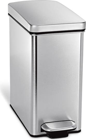Slim profile shape makes it a great fit in a bathroom or under a desk. Durable steel pedal is designed to last, and our patented lid shox technology ensures a smooth, silent close every time (stainless steel lid only). Although its removable inner bucket is grocery bag-compatible, our Code R custom fit liner fits this can perfectly — no bunching or slipping for a cleaner trash experience.