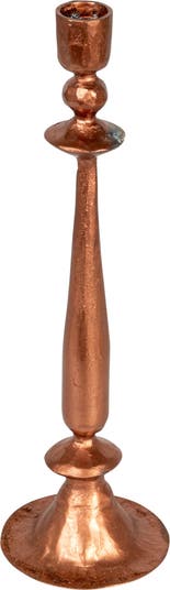 - A beautifully hand-forged cast metal taper holder with a rich copper finish that exudes rustic charm