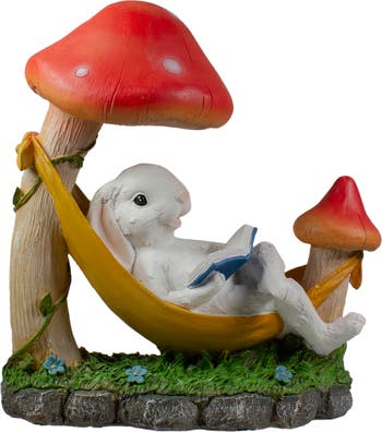 Perk up your garden decor with this adorable bunny reading a book in his hammock. The red mushrooms will catch your eye and of course who doesn't love a bunny! This will make a great addition to your backyard, front yard, garden, porch or to add a little fun to your indoor space. Product Features: White bunny outdoor garden statue Features a bunny relaxing and reading in the hammock Yellow hammock is attached to the mushrooms Perfect for patio or garden Recommended for indoor or outdoor Dimensions: 11.75"H x 11"W x 5.75"D Material(s): polyresin