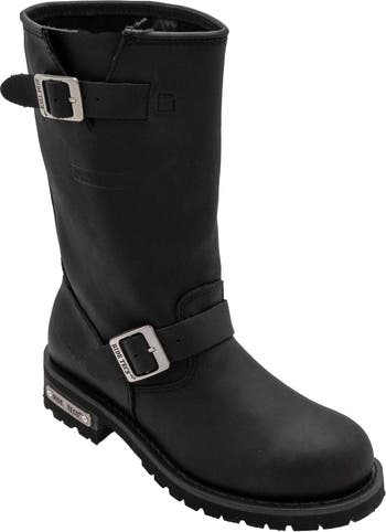 This 11 inch black heavy-duty full-grain leather upper engineer biker boot is tough enough to protect against any harsh work environment and classy enough to convey status. The split shaft and two adjustable straps with buckle closures allow for a tailored fit at the calf. There is also Goodyear welt construction that ensures durability.
