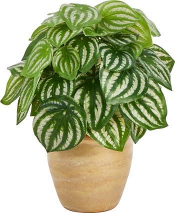 Create a , relaxing environment of realistic greenery with the help of this artificial plant boasting a thick collection of variegated watermelon peperomia leaves designed with naturally occurring qualities that feel real to the touch. Reaching 11” high from a ceramic planter, this realistic looking fake plant is great for either home or office display.