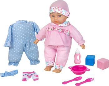 11" TALKING BABY SET: PINK & BLUE - Meet your child’s newest little companion with this adorable 11-inch Talking Baby Doll, dressed in a sweet pink outfit with delicate floral details and a matching hat, ready to inspire hours of imaginative play. This charming doll features six different sounds activated by pressing her tummy, bringing giggles and fun to every interaction while encouraging nurturing and role-playing skills. The set also includes a playful extra outfit in blue polka dots with matching socks and a coordinating headband, giving children the joy of dressing and changing their baby’s look. For mealtime adventures, she comes with a plate, spoon, fork, and bottle, plus two colorful play blocks to spark creativity and early building fun. Lightweight and easy for little hands to hold, this doll makes a perfect huggable friend, and with 3 LR44 batteries included, she’s ready for play right out of the box. Recommended for ages 3 and up, this delightful talking baby doll set is sure to bring endless fun, imaginative play, and cuddly companionship to any young child’s collection.