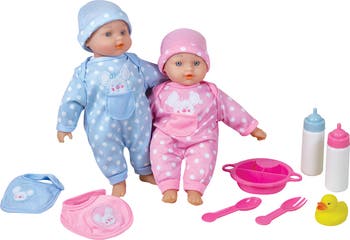 11" TWIN BABY DOLLS - PINK & BLUE - Double the fun and imagination with the Lissi 11" Twin Baby Dolls! This delightful 10-piece playset inspires hours of nurturing, pretend play, and storytelling adventures for children and toddlers ages 2 and up. Each adorable twin doll is dressed in a coordinating romper and matching cap—one in soft pink and the other in cheerful blue—ready for cuddles, feeding, and care. The set includes everything your little one needs for realistic baby play, including bibs, bottles, a plate, fork, spoon, and even a rubber ducky for bath time fun. Crafted from durable, child-safe plastic, these dolls are lightweight, easy for small hands to hold, and built to last through endless play sessions. Their sweet, friendly faces and soft bodies make them extra huggable, encouraging children to care for their dolls just like real babies. Whether it’s mealtime, nap time, or playtime, kids can create their own heartwarming routines and stories with their twin babies. Perfect for teaching empathy, responsibility, and creative role play, the Lissi 11" Twin Baby Dolls set makes a wonderful gift for birthdays, holidays, or any day that deserves a little extra love.