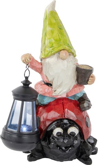 Enhance the beauty of your outdoor decor with this LED-lighted solar-powered garden statue. It features a cute gnome with a lantern standing on top of a ladybug. This will make a great addition to your backyard, front yard, garden, or porch. Product Features: Gnome and lady bug garden statue Solar powered LED lights are in the lantern Recommended for outdoor use Dimensions: 12.25"H x 8.25"W x 6.25"D Material(s): polyresin