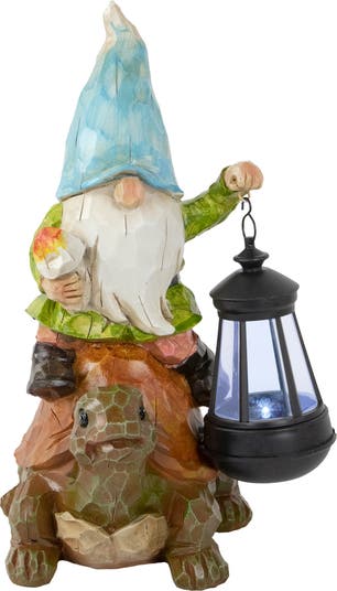 Enhance the beauty of your outdoor decor with this LED-lighted solar-powered garden statue. It features a cute gnome with a lantern standing on top of a turtle. This will make a great addition to your backyard, front yard, garden, or porch. Product Features: Gnome and turtle garden statue Solar powered LED lights are in the lantern Recommended for outdoor use Dimensions: 12.5"H x 8.25"W x 6.25"D Material(s): polyresin