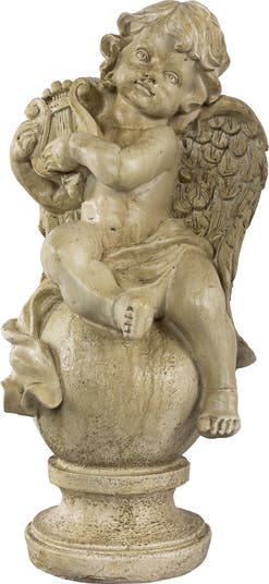 This decorative cherub with lyre garden statue is the perfect way to enhance your outdoor areas during the spring and summer months! This statue features an exciting design pattern and texture. It will be your treasured keepsake for many more years to come. Product Features Perfect way to enhance your outdoor areas during the spring and summer months Depicts a cherub angel sitting upon a globe pedestal, playing a lyre Meticulously sculpted by highly skilled artisans with fine attention to detail and a distressed almond brown finish with ivory accents Recommended for indoor and outdoor use Dimensions: 18"H x 8.5"W x 6"D Material(s): polyresin