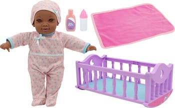 Make bedtime fun with your Little Darlings Crib Time Fun baby. 12” baby doll with removable outfit, blanket, crib, baby bottle & lotion bottle. Place her into her crib with blanket and rock her to sleep. She is always ready to play, just press her right hand to hear 6 different baby sounds! When she is hungry be sure to feed her with her baby bottle. Remember to always kiss her goodnight. Includes 12" baby doll with removable outfit, plastic crib, and blanket to place her to sleep in along with her baby bottle and play baby lotion bottle. This playset will provide hours of fun for your child!