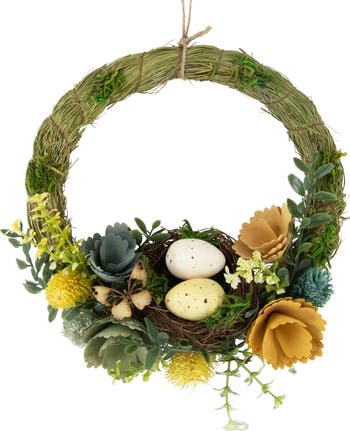 Bring the charm of spring to your home with this beautiful Easter wreath designed with a bird's nest. Adorned with speckled eggs, assorted green leaves and yellow burrs, it captures the essence of Easter, nature and spring all at once. The faux grass and wooden poppy flowers add a unique touch of natural beauty, while the jute rope makes it easy to hang on your door, wall, or mantel. This wreath is sure to delight your family and guests and become a cherished decoration for years to come. Product Features: Round green and yellow Easter wreath Two speckled eggs are nestled in a a birds nest Nest is accented with a decorative wooden butterfly Wreath backing is designed with layers of faux grass and moss Wooden poppy flowers, green leaves and yellow burrs Jute rope to hang or can be placed as a centerpiece No assembly required - wreath comes in 1 piece Recommended for indoor use - if using outdoors place under a covered area Dimensions: 10"H x 12"W x 3"D (wreath diameter includes decorative accents) Inner Dimension: 6" diameter Material(s): wood/faux grass/foam/plastic/metal
