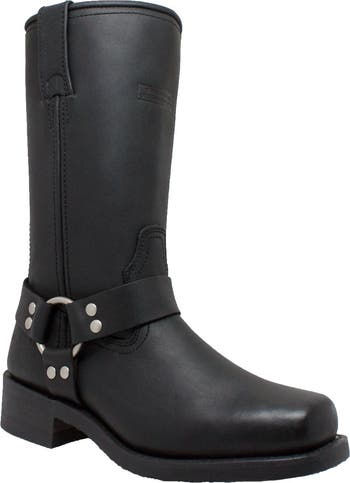 This 12in black heavy duty full grain oiled leather upper harness boot features rubber oil-resistant sole and heel, a square soft toe and cushion insole. It also has o-ring ankle harness strap with goodyear construction for security and durability.