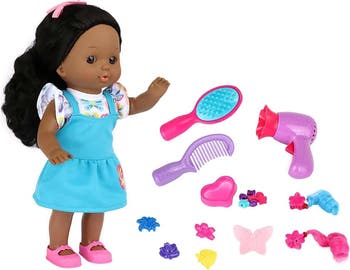 - 12" DOLL & HAIR ACCESSORY COLLECTION: Packed with everything a mini stylist needs, this set comes with a variety of hair clips, hair extensions, beads, styling tools, and a heart-shaped storage box to keep it all organized.