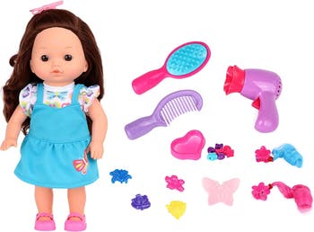 DREAM COLLECTION: 12" DOLL HAIR PLAY SET - BRUNETTE - Transform playtime into a salon adventure with this 12-Inch Hair Play Doll Set! Perfect for kids who love makeovers and dress-up fun, this doll is ready for a total glam session. With her soft brunette hair and included styling accessories, children can brush, bead, and create endless new looks. The set comes packed with everything a young stylist could need: hair extension clips, colorful beads, pretty hair clips, a brush, a comb, a heart-shaped storage box, and a realistic-sound blow dryer for immersive fun. Whether your child is experimenting with a new braid or giving their doll a total hairstyle makeover, the experience is hands-on, imaginative, and educational. It’s a fun way for kids to express themselves and build confidence through creative play. Packaged in a gift-ready, eco-friendly box with minimal packaging materials, this set makes a thoughtful present for birthdays, holidays, or just-because surprises. Set includes hair extension clips, hair clips, hair beads, brush, comb, heart shape box, hair dryer.