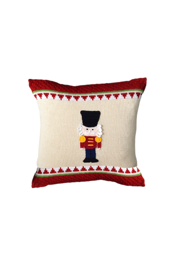 Bring a classic holiday touch to your home with this delightful knit holiday throw pillow. Featuring an embroidered nutcracker soldier in vibrant colors, this pillow captures the timeless charm of the holiday season. The soft cream background is beautifully complemented by festive red borders and accents. Crafted from high-quality cotton yarn, this pillow adds a cozy, seasonal flair to any room. Whether placed on a couch, chair, or bed, its vibrant colors and unique design are sure to catch the eye and bring holiday cheer to your space.