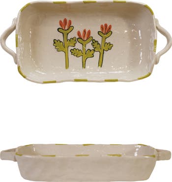 This 12 oz. Hand-Painted Stoneware Organic Shaped Baker with Handles & Flower is a delightful addition to any kitchen. Featuring a multi-colored, hand-painted floral design, this rectangular baker combines functionality with aesthetic appeal. Perfect for farmhouse, French country, or contemporary styles, it is ideal for serving individual portions of casseroles, baked goods, or side dishes. Made of durable stoneware, it ensures long-lasting use and a beautiful finish. Measures 10 inches in length, 5 inches in width, and 1.75 inches in height. The handles make it easy to transport from oven to table, adding convenience to its charm. Whether hosting a dinner party or simply cooking for everyone, this baker will elevate presentation and impress every guest.