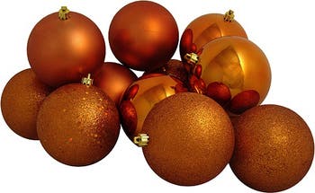 Celebrate the season and remember the magic of Christmas with these shatterproof ornaments. Shatterproof ornaments combine the beauty and luster of real glass with the unbreakable practicality of plastic. This special pack will allow you to build your collection quickly and decorate with more possibilities. Product Features: 12-piece set Color: burnt orange Comes in 4 finishes: shiny, matte, glitter drenched, and holographic glitter sparkle Balls are equipped with gold ornament caps Pack of matching gold string hangers are included for optional use (ornament hooks not included) Dimensions: 4" (100mm) diameter Material(s): plastic/glitter Set includes 3 of each item shown, for a total of 12 pieces