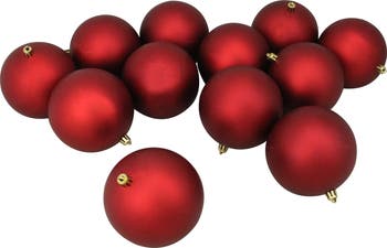 Be ready for this holiday season with these fun matte ornaments. Decorate your Christmas tree, or use these beautiful ornaments for a craft project. Shatterproof ornaments combine the beauty and luster of real glass with the unbreakable practicality of plastic. Product Features: 12-piece set Color: red hot Finish: matte Balls are equipped with gold ornament caps Pack of matching gold string hangers are included for optional use (ornament hooks not included) Shatterproof for your safety and convenience Recommended for indoor decorative use only Dimensions: 4" (100mm) diameter Material(s): plastic