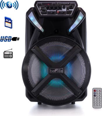 Take the party anywhere with the beFree Sound 12" BT Portable Rechargeable Party Speaker! This 10 lbs. party speaker is fully mobile with rolling wheels and a carrying handle for easy transportation. Not only is this speaker mobile, but this system comes complete with sound reactive lights, USB/TF compatibility, a remote control, and an FM radio for an all in one party experience! Item Dimensions: 20.50" x 12.00" x 11.00" Item Weight: 10.00lbs