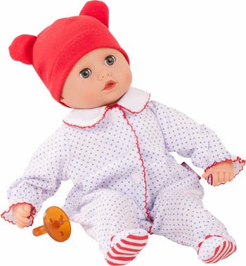 - Gotz 13" Muffin has a soft cudly body with beautiful blue eyes that open and close. Muffin wears blue and white polka dot footed pajamas with red trim to match the adorable red cap with animal ears. Clothing is easy to take on and off.