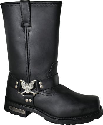 This 13 inch black heavy duty full-grain leather upper harness boot is the most technologically advanced motorcycle harness biker boot ever. A variation of one of our best sellers, this boot now features a Side zipper for convenient On-Off. A split shaft and o-ring ankle harness strap give a great classic look. Another plus is the Goodyear welt construction that ensures durability.