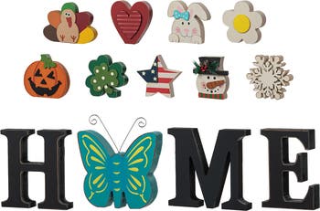 This 13-piece Interchangeable Home Sentiment is a fun and simple way to celebrate the time of year. Place the pieces next to each other to spell out "HOME", with the "O" being replaced by one of 10 icons that represent the season.