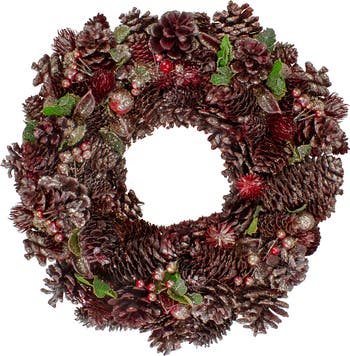 Make a one-of-a-kind display in your home this season with this decorated wreath. The wreath features gold glittered red berries, pinecones, and leaves. This wreath will be a great addition to your Christmas decor whether you add it to a door, wall, or even used as a centerpiece for your holiday festivities. Product Features: Artificial Christmas wreath The wreath is gold, red and green Features berries, leaves, and pinecones Round in shape Unlit Recommended for indoor use - if using outdoors place under a covered area No assembly required – wreath comes in 1 piece Dimensions: 13" diameter (measured from outermost tip/edge to outermost tip/edge across the wreath) Material(s): plastic/wood