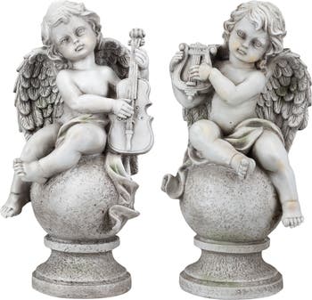Revamp your patio decor with these exquisite garden statues. These sitting cherub angel statues are a great decorative addition in any home complementing any decor style. Versatility and durability of the statue make it more life-like and impressive. Product Features: These charming cherub angels are sitting on the top of round textured finials One is playing the harp while the other is playing the violin Features hints of color for a unique look Perfect addition to any garden or outdoor decor For indoor or outdoor use Dimensions: Harp cherub: 14.75"H x 7.25"W x 6.5"D Violin cherub: 14.75"H x 7.75"W x 6.5"D Material(s): polyresin