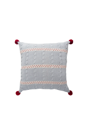 Add a cozy and festive touch to your home with this knit holiday throw pillow. The pillow features a classic cable-knit design in soft gray, accented by delicate red and ivory stripes that bring a subtle holiday flair. The corners are finished with playful red pom-poms, adding a touch of charm to the overall look. Crafted from high-quality cotton yarn, this pillow adds a cozy, seasonal flair to any room. Whether placed on a couch, chair, or bed, its vibrant colors and unique design are sure to catch the eye and bring holiday cheer to your space.