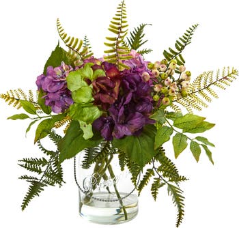 Gorgeous green and purple hydrangea blooms sit clustered together on top of a cushion of green foliage. With small, delicate berries hiding with in the flowers and a variety of ferns and greenery, the artificial hydrangea and berry arrangement is the perfect addition to any decor. Boasting a glass vase with faux water this piece is the ideal centerpiece for a formal dining room table. Place it on a mirrored surface to complete the look.
