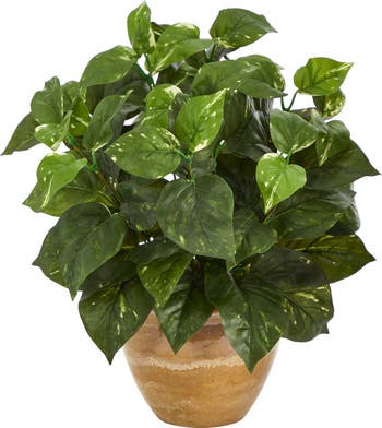 Explosive greenery pours forth from this artificial plant boasting a natural overgrowth of realistic looking pothos foliage, designed from the finest materials in a palette of bright, rich evergreens. Standing 14” high from a ceramic planter and stabilized with natural moss, this charming fake plant would easily elevate a bare window or counter space.