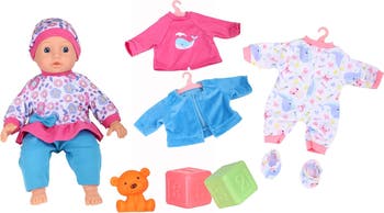 DREAM COLLECTION: 14" BABY DOLL - Let your child's imagination soar with this adorable 14” Baby Doll from the Dream Collection! Designed for endless hours of creative pretend play, this beautifully crafted doll is perfect for nurturing, role-playing, and creating special childhood memories. With a soft, huggable body and a lifelike appearance, this baby doll will quickly become your little one’s favorite companion. Its bright blue eyes sparkle with charm, adding to the baby doll's sweet and lifelike expression. Dressed in a charming, colorful outfit, this doll is made from high-quality, eco-friendly materials that are strong, durable, and resistant to moisture—ensuring it will last through years of love and play. It comes in an attractive gift box, making it an ideal present for birthdays, Christmas, or any special occasion. This set includes an extra outfit, building blocks, an adorable little bear, and shoes, providing even more opportunities for engaging and imaginative play. Whether dressing up, feeding, or rocking their baby to sleep, your child will learn valuable nurturing skills while having endless fun. Perfect for children aged 2 years and older, this sweet baby doll will inspire creativity, encourage social development, and create cherished memories that will last a lifetime. Give your little one the gift of love, care, and companionship with this delightful Dream Collection Baby Doll!
