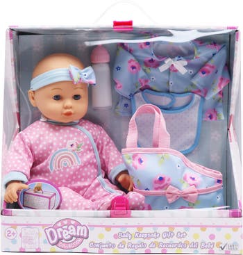 DREAM COLLECTION: BABY KEEPSAKE GIFT SET - This beautiful baby doll from the Dream Collection will ignite your little one's imagination and bring endless hours of creative pretend play. Dressed in a two piece outfit with an adorable hat. Made from high-quality eco-friendly materials that are resistant to moisture, strong and durable, this 14 in. hard body doll comes in an attractive gift box, making it the ideal present for birthdays or Christmas. Perfect for learning to nurture and love with their first friend – your little one will adore dressing her up, feeding her, and rocking her to sleep! Suitable for kids aged 2 years and older, it's sure to create special memories that will last a lifetime. This Baby Keepsake Gift Set INCLUDES 1 doll, 2 pc outfit, 1 Hat, 1 Bib, 1 Extra outfit, 1 Accessory bag, and 1 Bottle.