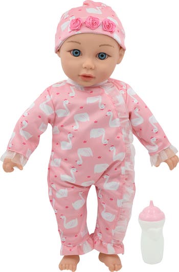 • 14" SOFT BODY BABY DOLL: The doll is wearing a removable one-piece garment. The pink, white and swan design is sure to delight young ones. Her outfit is complete with a matching sleeping cap.