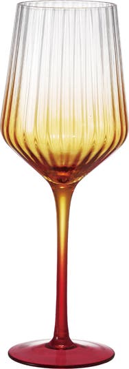 Add the set of 4 Stemmed Fluted Wine Glasses to introduce a touch of sophisticated style and vibrant color to a dining experience. This wine glass is a true statement piece, featuring a beautiful ombre effect that transitions from a rich orange hue at the base to a subtle clear at the rim. The delicate fluted texture and slender stem give it a graceful silhouette that feels both timeless and modern. The glass's versatile aesthetic makes it a perfect fit for a wide range of styles, from Transitional and Glam to French Country and Cottagecore. Made of delicate hand-blown glass, this glass measures 3.75 inches in diameter and 9.5 inches in height and holds up to 14 ounce. This piece provides a beautiful and unique way to serve drinks in style.