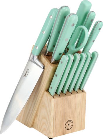 Chop, slice, dice, and mince in style with this 14 piece countertop cutlery set. Having the right set of knives makes cooking easier, more comfortable, and is important for efficiency in the kitchen; that is where this Martha Stewart knife set comes in. This set comes with all your every day essentials including a chefs knife, santoku knife, bread knife, utility knife, steak knives, paring knife, kitchen shears, and sharpening steal. Heavy duty forged construction provides balance and durability. High carbon stainless steel blades retain exceptionally sharp edges. Ergonomic triple- riveted handles with full tang for comfort and control. Ash wood sotrage block has a natural and rustic finish and will keep all your tools in place while adding some beauty to your countertops and saving space in your drawers. Item Dimensions: 7.00" x 5.00" x 13.50" Item Weight: 6.55lbs