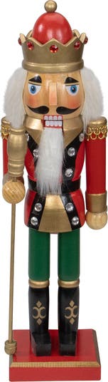 Add a new twist to your holiday decor with this King nutcracker. The perfect way to celebrate your Christmas holiday by displaying this nutcracker on tabletops, mantles, and desks. Give as a gift to a loved one or for yourself. Product Features: Wooden nutcracker king Hand-painted by skilled artisans Holding gold scepter in hand with gold crown accented with red jewels Stands on an attached red wooden base Mouth opens and closes with the lever in the back Nutcracker face is hand-painted with white hair and beard Recommended for indoor decorative purposes only Dimensions: 14"H x 3.25"W x 4"D Material(s): wood/faux fur/plastic