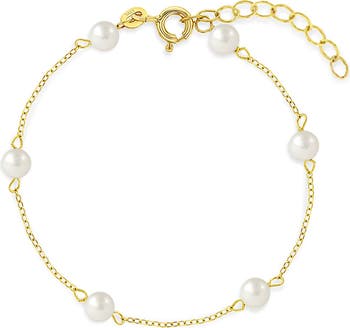 A delicate freshwater cultured pearl strand bracelet crafted from 14k yellow gold. This sweet bracelet measures 5" and can be extended to 6" the perfect size for baby girls and little girls. She will love to wear this bracelet any chance she gets. The sweet 4mm freshwater cultured pearls make for a beautiful detail that can be paired with any outfit or accessory. Gift box included with purchase.