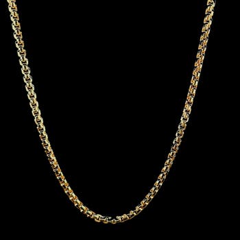 A 14K yellow gold box link chain necklace with a polished finish and lobster clasp. It measures 2.3 mm wide, 20 inches long, weighs 7.2 g, and is made in Italy.