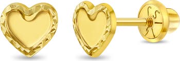 Adorable and elegant, these heart-shaped earrings are a sweet addition to any little girl’s jewelry collection. Each earring features a classic heart design with a beautifully braided edge, adding a touch of texture. Crafted from 14k yellow gold, they’re not only stylish but also safe and gentle for sensitive skin. For everyday wear or special occasions, these earrings make a thoughtful gift she'll treasure. A small gift box is included with purchase.