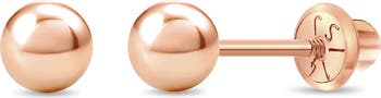 Classic, petite and sparkly, these 14k rose gold earrings for girls are simply perfect for daily use. Featuring a bright and flawless round-shaped ball, these girl's earrings are ideal for ages (1-16 years). Crafted entirely of 14k rose gold, these earrings are suitable for sensitive ears, featuring very precious material and fine craftsmanship. The threaded safety screw-back design secures them to your child’s ears. These 14k earrings make a great gift and include a complimentary gift box.