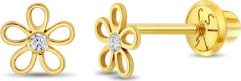 Add a dazzling pair of earrings to your sweet little girls spring jewelry collection with these adorable clear cubic zirconia flower earrings. A lovely pair of flower studs that are ideal for spring and summer to add an extra dose of glimmer. Featuring a small clear cubic zirconia stone at its center, this small pair of flowers will elevate any of her looks. Safety screw back closures are added to prevent earrings from falling, and remain securely in place. A complimentary gift box is included.