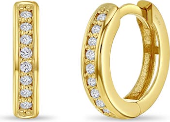 Add some sparkle to your little girls outfits with this beautiful pair of huggie hoop earrings. An extra small pair of huggies that feature beautiful clear cubic zirconia stones throughout the front of the huggie. This fun pair of huggie hoops can be paired with your little one special occasion outfits or can be worn on a regular basis. Created from 14k yellow gold, these little huggie hoops arrived neatly packaged into a gift box for for easy gifting.